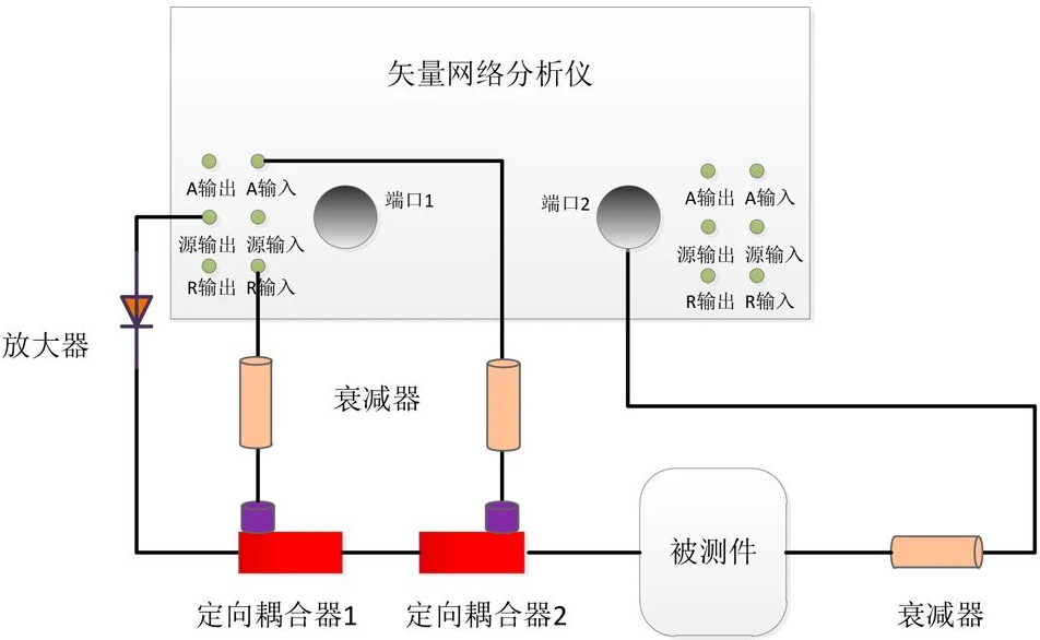 大功率輸入信號(hào)測(cè)試系統(tǒng)主要組成部分為矢量網(wǎng)絡(luò)分析儀、放大器、兩個(gè)定向耦合器、被測(cè)件和衰減器組成,如圖2所示。網(wǎng)絡(luò)儀輸出信號(hào)經(jīng)由前面板跳線源輸出端口到達(dá)放大器,信號(hào)被放大器放大后接入定向耦合器1,定向耦合器1的直通端連接定向耦合器2,耦合端經(jīng)過(guò)固定衰減器衰減后接入前面板跳線R輸入。定向耦合器2接收到被測(cè)件返回的信號(hào)后,通過(guò)耦合端連接的衰減器直接反饋到前面板跳線A輸入端口。