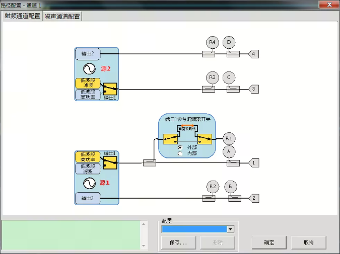 (1)按照原理圖連接測(cè)試系統(tǒng)。由于本方案需要使用系統(tǒng)前面板新號(hào)接口,因此需要進(jìn)行通道配置:【通道】→【硬件設(shè)置】→【圖形配置】,端口1參考混頻器開關(guān)切換到“外部”;配置源1為低波段高功率模式,如圖3所示。