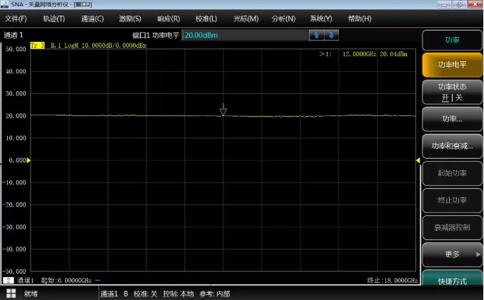 設(shè)置輸出功率為20dBm,觀察接收機(jī)B測(cè)量曲線,測(cè)試結(jié)果如圖11所示,圖中12GHz頻點(diǎn)接收機(jī)B接收功率變?yōu)?0.04dB,差值為0.04。