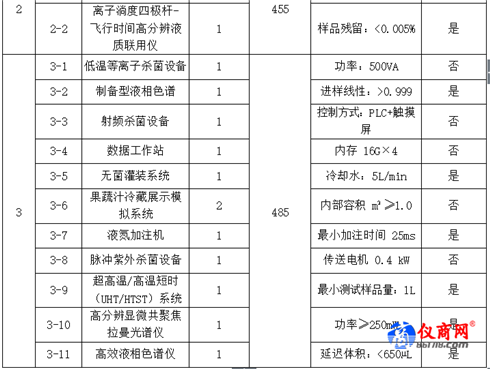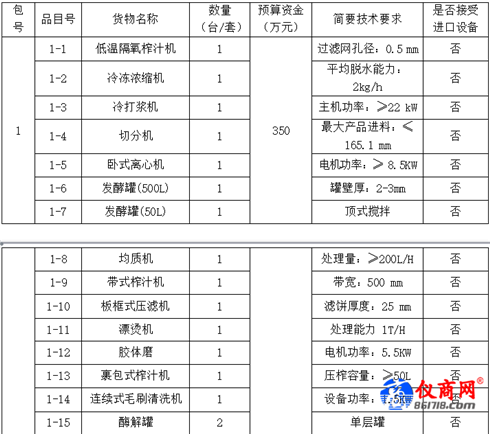 公告顯示,該項目分為三個包。“品目1-9帶式榨汁機”為第1包核心品目,包括低溫隔氧榨汁機、冷凍濃縮機、冷打漿機、切分機、臥式離心機、發(fā)酵罐(500L)、發(fā)酵罐(50L)、均質(zhì)機、帶式榨汁機、板框式壓濾機等15類16套儀器;“品目2-1 全自動微生物鑒定及藥敏分析系統(tǒng)”為第2包核心品目。包括全自動微生物鑒定及藥敏分析系統(tǒng)、離子淌度四極桿- 飛行時間高分辨液質(zhì)聯(lián)用儀兩套儀器。