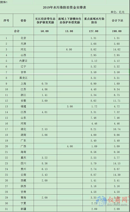 相關(guān)媒體近期在財(cái)政部網(wǎng)站查閱到,財(cái)政部于6月中旬下發(fā)通知,安排全國各省、自治區(qū)、直轄市財(cái)政廳2019年用于氣、水、土污染防治方面的資金預(yù)算,總金額達(dá)490億。據(jù)業(yè)內(nèi)人士觀點(diǎn),此批大額專項(xiàng)資金,必涉及多項(xiàng)儀器儀表采購,相關(guān)廠家可進(jìn)一步關(guān)注。以下是財(cái)政部通知內(nèi)容。