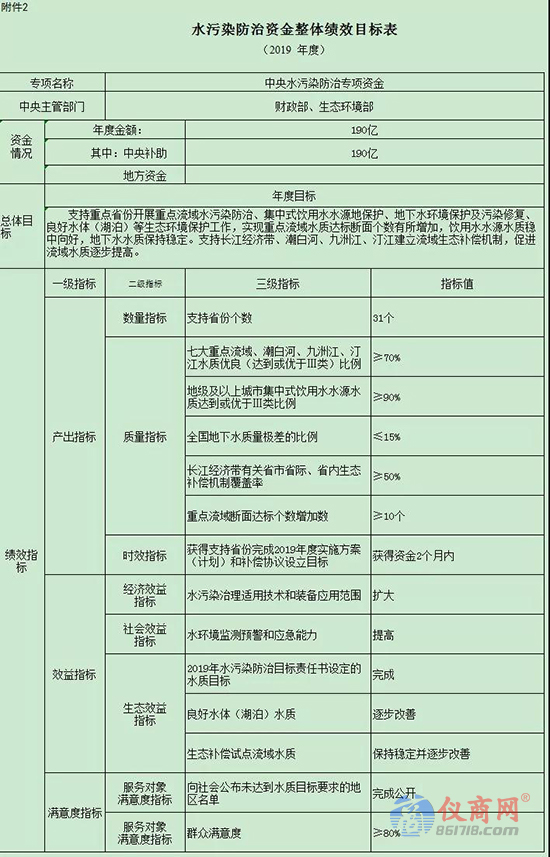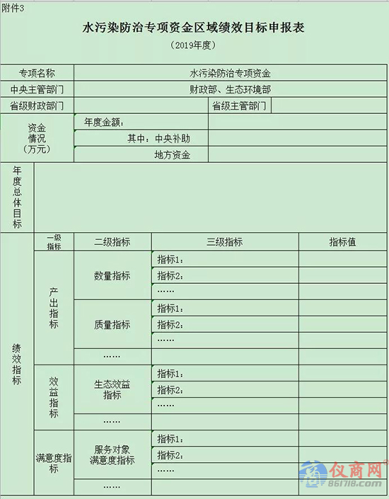 六、為進(jìn)一步加強(qiáng)預(yù)算績效管理,請(qǐng)按照《中共中央國務(wù)院關(guān)于全面實(shí)施預(yù)算績效管理的意見》(中發(fā)〔2018〕34號(hào))的要求,完善績效目標(biāo)管理,科學(xué)填報(bào)《水污染防治資金區(qū)域績效目標(biāo)申報(bào)表》(附件3),并在收到本通知之日起30日內(nèi)報(bào)我部和生態(tài)環(huán)境部備案,做好績效監(jiān)控和績效評(píng)價(jià),確保財(cái)政資金安全有效。請(qǐng)參照中央做法,將你?。ㄗ灾螀^(qū)、直轄市)確定后的績效目標(biāo)及時(shí)對(duì)下分解,做好預(yù)算績效管理工作?!端廴痉乐钨Y金區(qū)域績效目標(biāo)申報(bào)表》和分解下達(dá)(或?qū)徍送ㄟ^的市縣)績效目標(biāo)要同時(shí)抄送財(cái)政部各地監(jiān)管局。