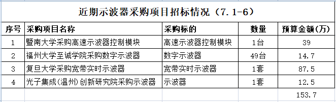 近日,中國政府采購網(wǎng)發(fā)布了幾個示波器采購項目,包括暨南大學(xué)采購1臺高速示波器控制模塊、福州大學(xué)至誠學(xué)院采購數(shù)字示波器49臺、復(fù)旦大學(xué)采購寬帶實時示波器1套以及光子集成(溫州)創(chuàng)新研究院采購示波器1套,其中,示波器采購預(yù)算金額為153.7萬。