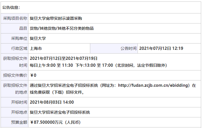 2021年7月12日,中國政府采購網(wǎng)發(fā)布了《復(fù)旦大學(xué)寬帶實(shí)時(shí)示波器采購公開招標(biāo)公告》。公告內(nèi)容顯示,復(fù)旦大學(xué)擬采購1套寬帶實(shí)時(shí)示波器,預(yù)算金額為87.5萬。