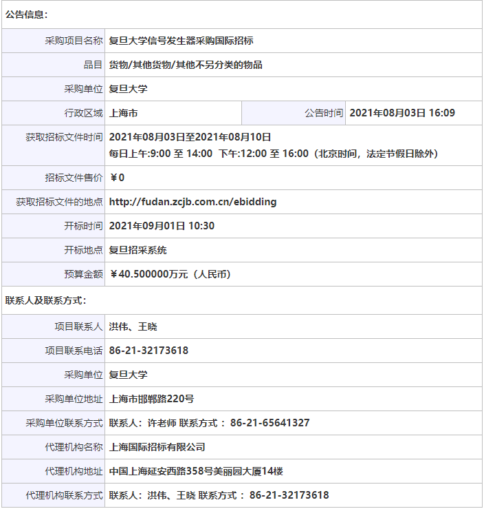 近日,中國政府采購網(wǎng)發(fā)布《復(fù)旦大學(xué)信號發(fā)生器采購國際招標(biāo)公告》。公告內(nèi)容顯示,復(fù)旦大學(xué)擬采購1套信號發(fā)生器,預(yù)算金額為40.5萬。其中,技術(shù)規(guī)格方面,要求信號發(fā)生器的頻率范圍不窄于:8kHz~31.8GHz;而合同履行期限要求為:簽訂合同后3個(gè)月內(nèi)。