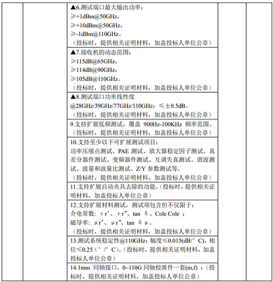 功能要求:工作頻率覆蓋到 110GHz,同時具備工作頻率達到 500GHz 能力的毫米波(太赫茲)測試設備。S 參數測試(包括阻抗、駐波比、增益、史密斯圓圖、傳輸增益或損耗、相位、相位非線性、時間延遲等)、混合模 S 參數測試、功率壓縮點測試、PAE 測試、放大器穩(wěn)定因子測試、真差分器件測試、變頻器件測試、互調失真測試、諧波測試、波量和波量比測試、Z/Y 參數測試等??蓽y量全兩端口 S 參數,如 S11、S22、S21、S12 等。