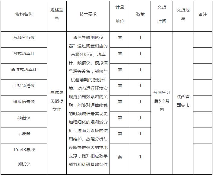 項目名稱與概況:陜西省西安市某學院采購通信導航測試儀器項目,采購音頻分析儀、臺式功率計、通過式功率計、手持頻譜儀、模擬信號源、頻譜儀、示波器、1553B總線測試儀。