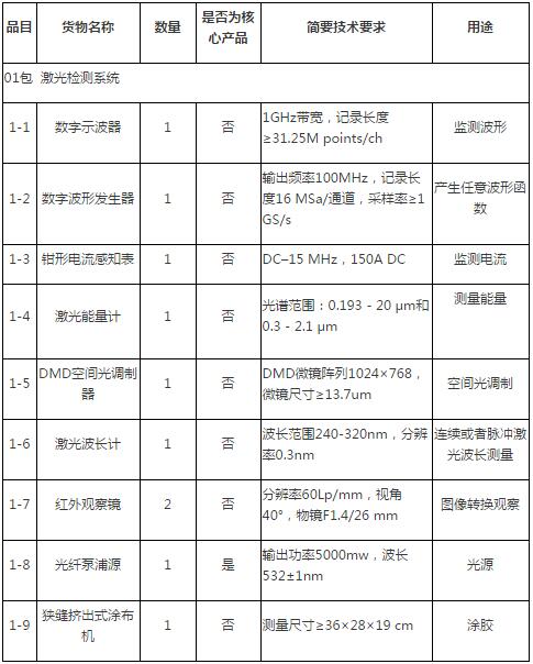 項(xiàng)目名稱(chēng)與概況:中國(guó)科學(xué)院大學(xué)光電學(xué)院激光檢測(cè)系統(tǒng)采購(gòu)項(xiàng)目,采購(gòu)數(shù)字示波器、數(shù)字波形發(fā)生器、鉗形電流感知表、激光能量計(jì)、光纖泵浦源等儀器設(shè)備。