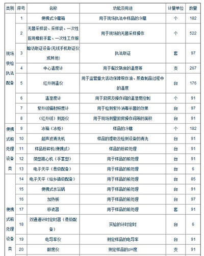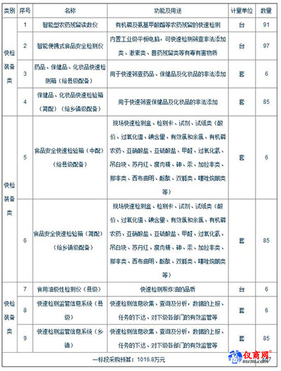 寧夏回族自治區(qū)食品藥品監(jiān)督管理局在保障該區(qū)食藥安全方面發(fā)揮重要的保障作用。為提升該區(qū)的檢測能力,保障食藥安全,該局在儀器設(shè)備采購方面大標(biāo)不斷,特別是在快檢儀器方面。日前,寧夏回族自治區(qū)食品藥品監(jiān)督管理局發(fā)布2018年市縣鄉(xiāng)鎮(zhèn)快檢室建設(shè)項(xiàng)目招標(biāo)公告(采購計(jì)劃編號:2018NCZ000901W),鑒于縣鄉(xiāng)鎮(zhèn)快檢室建設(shè)需求,擬預(yù)算1784.55萬元采購3391臺(tái)/套儀器設(shè)備。