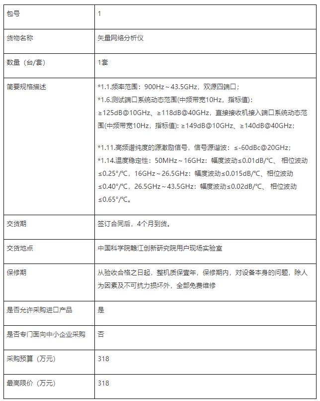 另外,中國科學(xué)院贛江創(chuàng)新研究院也發(fā)布了矢量網(wǎng)絡(luò)分析儀采購項目公開招標公告。中國科學(xué)院贛江創(chuàng)新研究院擬采購1套矢量網(wǎng)絡(luò)分析儀,預(yù)算金額為318萬元(人民幣),最高限價(如有)為318萬元(人民幣)。采購需求如下: