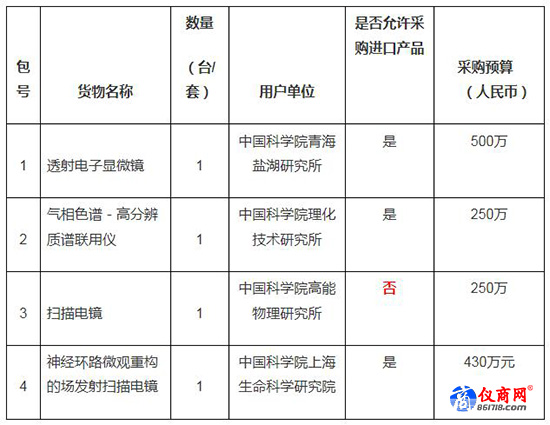 2018年8月24日,中國政府采購網(wǎng)消息,中國科學(xué)院各研究所對中國科學(xué)院2018年儀器設(shè)備部門集中采購項目(第二批)進行公開招標,采購3套電子顯微鏡及一套氣質(zhì)聯(lián)用儀,其中掃描電鏡不接受進口產(chǎn)品投標,預(yù)算總金額為1430萬元。詳細內(nèi)容如下: