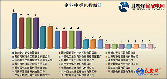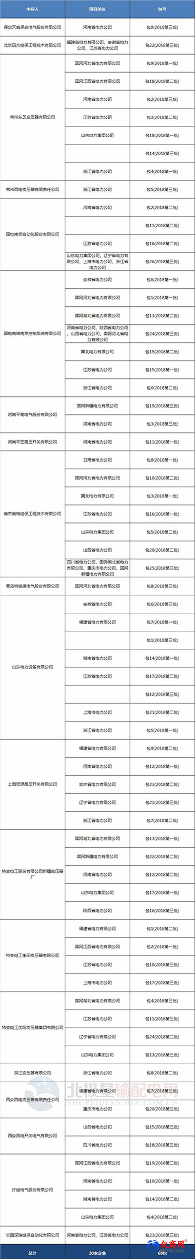 據(jù)統(tǒng)計(jì),2018年前三次的“輸變電項(xiàng)目整站招標(biāo)”共有20家企業(yè)分得這68包。其中,山東電力設(shè)備有限公司獲得8包;國電南瑞南京控制系統(tǒng)有限公司、常州東芝變壓器有限公司、南京南瑞繼保工程技術(shù)有限公司獲得7包;特變電工股份有限公司新疆變壓器廠、上海思源高壓開關(guān)有限公司獲得5包;特變電工沈陽變壓器集團(tuán)有限公司、特變電工衡陽變壓器有限公司、許繼電氣股份有限公司、國電南京自動(dòng)化股份有限公司獲得4包。