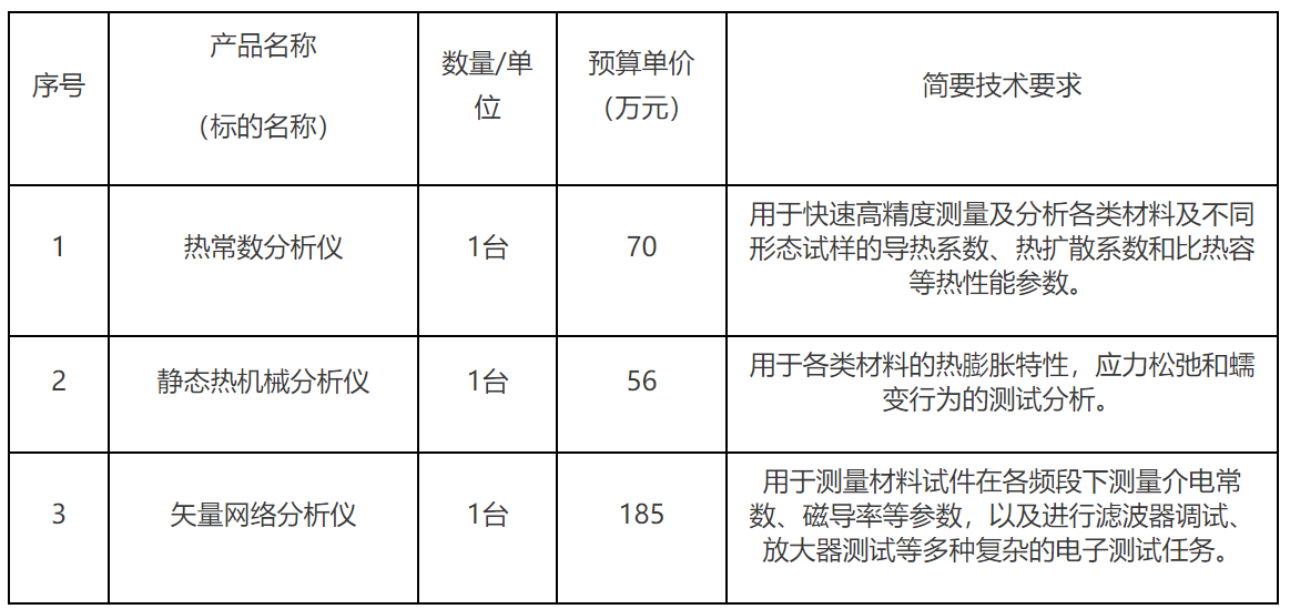 公告內(nèi)容顯示,哈爾濱工程大學(xué)高性能集成電路封裝材料條件建設(shè)項(xiàng)目擬采購(gòu)1臺(tái)熱常數(shù)分析儀、1臺(tái)靜態(tài)熱機(jī)械分析儀以及1臺(tái)矢量網(wǎng)絡(luò)分析儀,預(yù)算金額311萬(wàn)元!