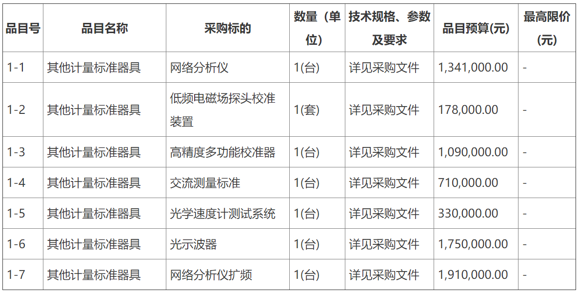 這次采購的計量儀器設(shè)備包括網(wǎng)絡(luò)分析儀、低頻電磁場探頭校準(zhǔn)裝置、高精度多功能校準(zhǔn)器、交流測量標(biāo)準(zhǔn)、光學(xué)速度計測試系統(tǒng)、光示波器以及網(wǎng)絡(luò)分析儀擴(kuò)頻。