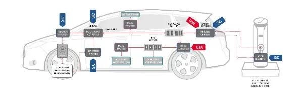 功率器件是推動交通運輸、可再生能源和工業(yè)市場實現(xiàn)電氣化的關鍵元器件。電力轉(zhuǎn)換器(即牽引逆變器)在電動交通中的主要應用是高效轉(zhuǎn)換電動汽車(EV)高壓電池組中存儲的電量,從而驅(qū)動交流電動機。電動汽車的電力轉(zhuǎn)換器還有許多其他應用(見圖),包括用于車輛到電網(wǎng)應用的關鍵環(huán)節(jié)——車載充電器。