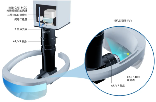 德國(guó)Instrument Systems的LumiTop AR/VR系統(tǒng)的潛望式鏡頭,可深入AR/VR頭戴式設(shè)備并高度模擬人眼。即使在空間有限的生產(chǎn)條件下,也能同時(shí)測(cè)量雙眼。