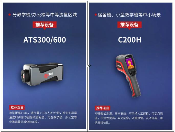 針對校門、食堂、圖書館、教學樓、宿舍樓等不同人流量通道場景,推薦4款非接觸、高靈敏、可靈活部署的紅外熱像儀: