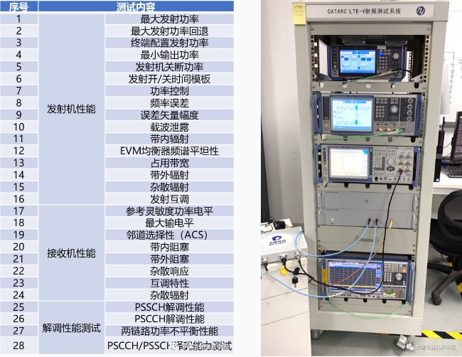 中國在C-V2X技術(shù)和應(yīng)用上領(lǐng)先世界,也在建立支持技術(shù)持續(xù)領(lǐng)先的檢測能力,認(rèn)證流程和測試條目不同于國外。LTE-V2X標(biāo)準(zhǔn)中要求的射頻測試是為了保證OBU/RSU的硬件射頻性能,測試內(nèi)容包括發(fā)射機(jī)、接收機(jī)和解調(diào)性能三部分,詳細(xì)測試內(nèi)容如下表所示。主要測試設(shè)備是R&S公司的CMW500、SMBV100B、SMW200A和FSW等儀表。被測C-V2X產(chǎn)品采用宸芯自研C-V2X芯片CX7100產(chǎn)品開發(fā)。在本次射頻測試中CX7100模組展現(xiàn)出了優(yōu)秀的性能指標(biāo),協(xié)助被測產(chǎn)品順利通過所有測試。