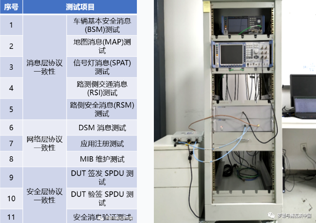 協(xié)議一致性測試是為了測試OBU/RSU的上層通信協(xié)議是否與標(biāo)準(zhǔn)要求協(xié)議一致,以達(dá)到不同廠家OBU/RSU之間互聯(lián)互通的目的。依據(jù)相關(guān)YD標(biāo)準(zhǔn),被測RSU也通過了上層協(xié)議相關(guān)測試項目,包含消息層、網(wǎng)絡(luò)層、安全層三層的協(xié)議測試用例。主要測試設(shè)備是R&S公司的CMW500、SMBV100B和相關(guān)系統(tǒng)軟件。