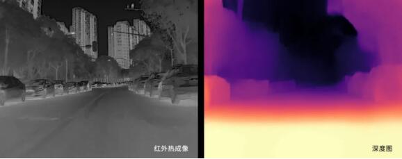 如下所示,左圖為紅外熱成像圖像數(shù)據(jù),分辨率為640×512,右圖是對(duì)左圖進(jìn)行深度估計(jì)的深度圖,越淺的地方表示目標(biāo)越近,越深的地方表示目標(biāo)越遠(yuǎn)。深度圖的分辨率與原圖一致,為640×512。