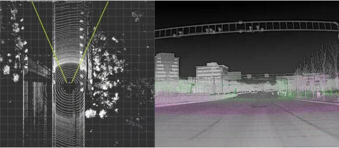 如下所示,左圖是激光雷達(dá)點(diǎn)云數(shù)據(jù),右圖是雷達(dá)點(diǎn)云在640×512的紅外圖像上映射效果。圖中由紫到綠代表著距離由近到遠(yuǎn)。點(diǎn)云數(shù)據(jù)作為紅外深度估計(jì)的距離真值,用于評(píng)測(cè)算法性能。