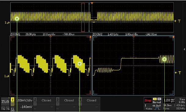 數(shù)據(jù)挖掘型示波器支持雙ZOOM縮放,查看波形整體脈絡時,可同步查看屏幕中不同范圍的兩段波形,同時對比細節(jié)的差異,對于分析異常波形、撰寫分析報告非常方便。