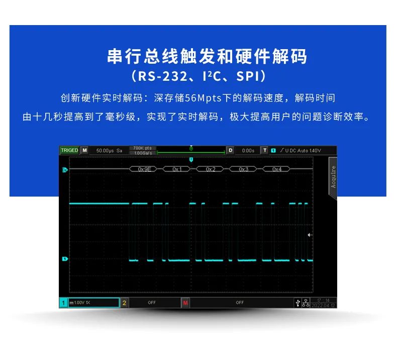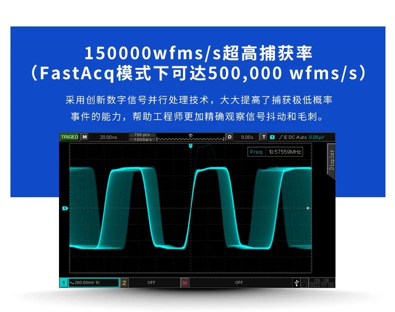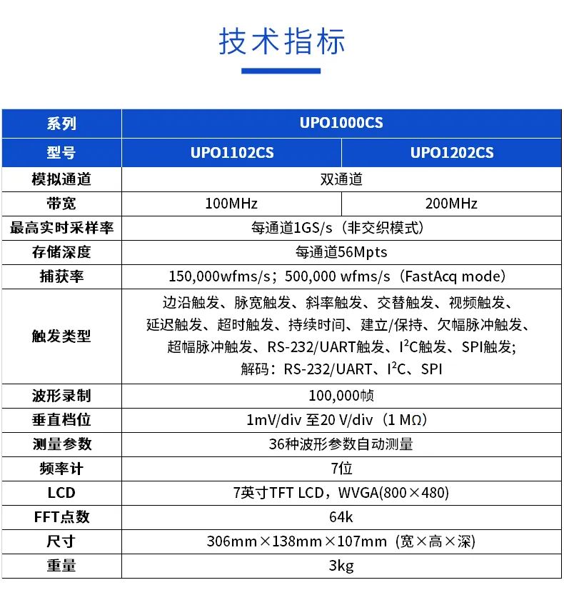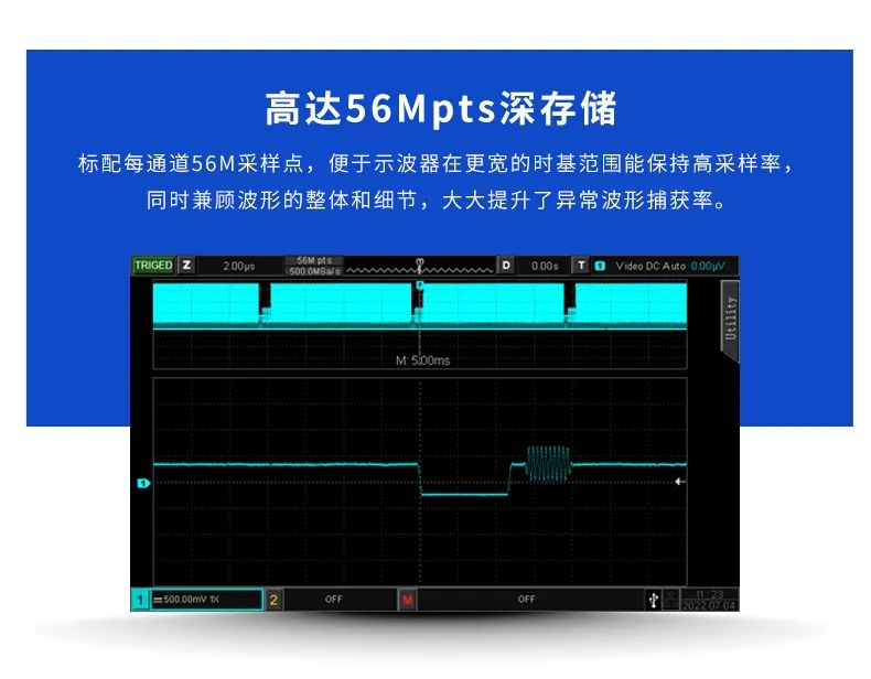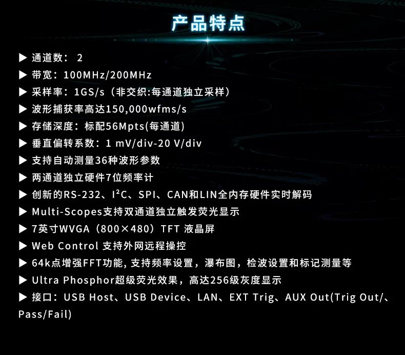 UPO1000CS系列配置200MHz/100MHz兩個(gè)級(jí)別帶寬,硬件非交織獨(dú)立采樣每通道1GS/s采樣率,標(biāo)配存儲(chǔ)深度高達(dá)56Mpts(每通道),高速波形捕獲率150,000wfms/s可以快速地發(fā)現(xiàn)信號(hào)中的異常毛刺和偶發(fā)事件,從而大幅提高工程師的調(diào)試效率。