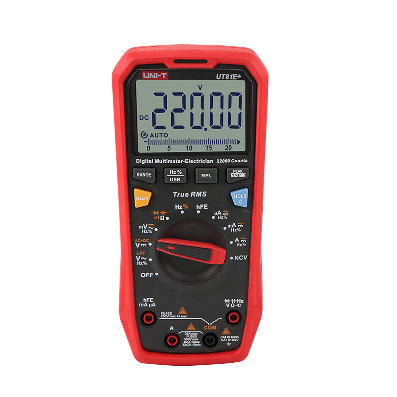 UT61E+是一款性能穩(wěn)定、高可靠性手持式真有效值數(shù)字萬用表, 可用來測量:交直流電壓、交直流電流、電阻、電容、頻率、占空比、二極管、三極管及電路通斷等。其主要產(chǎn)品特點如下: