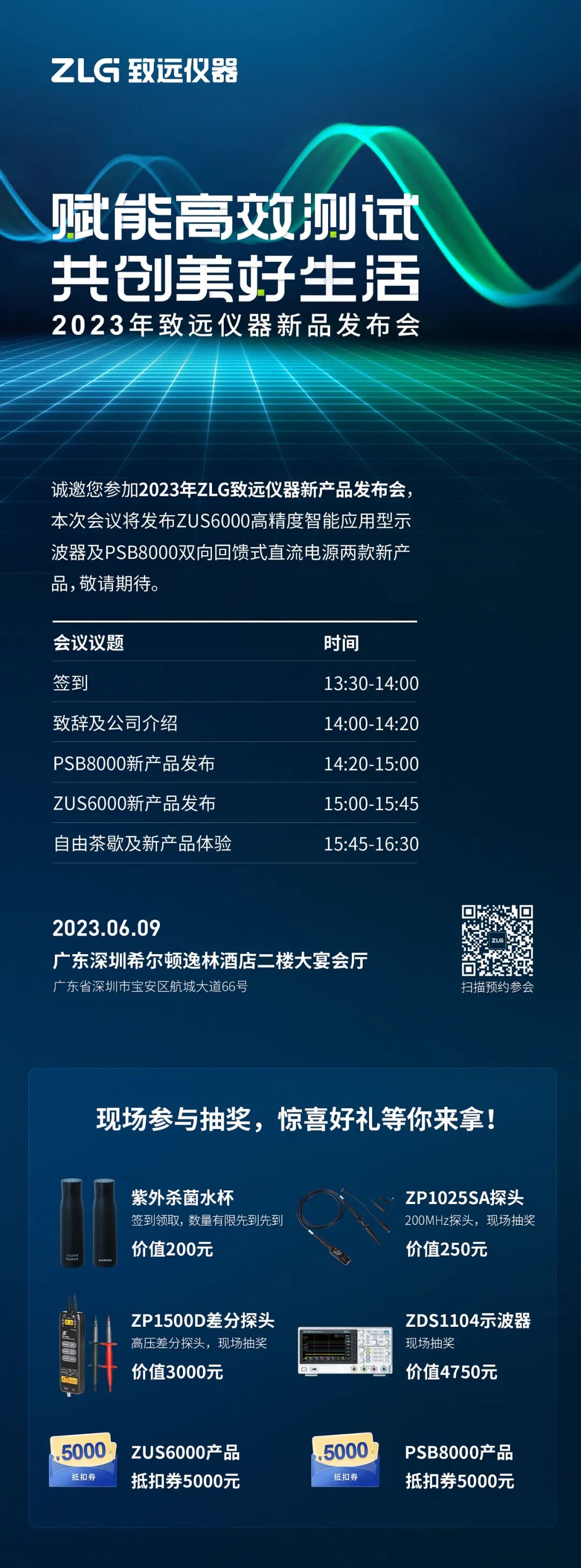 2023年ZLG致遠(yuǎn)儀器新產(chǎn)品發(fā)布會(huì)將于6月9日下午在深圳隆重舉行,屆時(shí)將發(fā)布ZUS6000高精度智能應(yīng)用型示波器及PSB8000雙向回饋式直流電源兩款新產(chǎn)品。