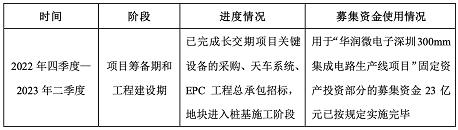 截至目前,“華潤微電子深圳 300mm 集成電路生產(chǎn)線項目”進展情況如下。如圖所示,華潤微已完成長交期項目關(guān)鍵設(shè)備的采購、天車系統(tǒng)、 EPC 工程總承包招標,地塊進入樁基施工階段,而用于“華潤微電子深圳 300mm 集成電路生產(chǎn)線項目”固定資產(chǎn)投資部分的募集資金 23 億 元已按規(guī)定實施完畢。