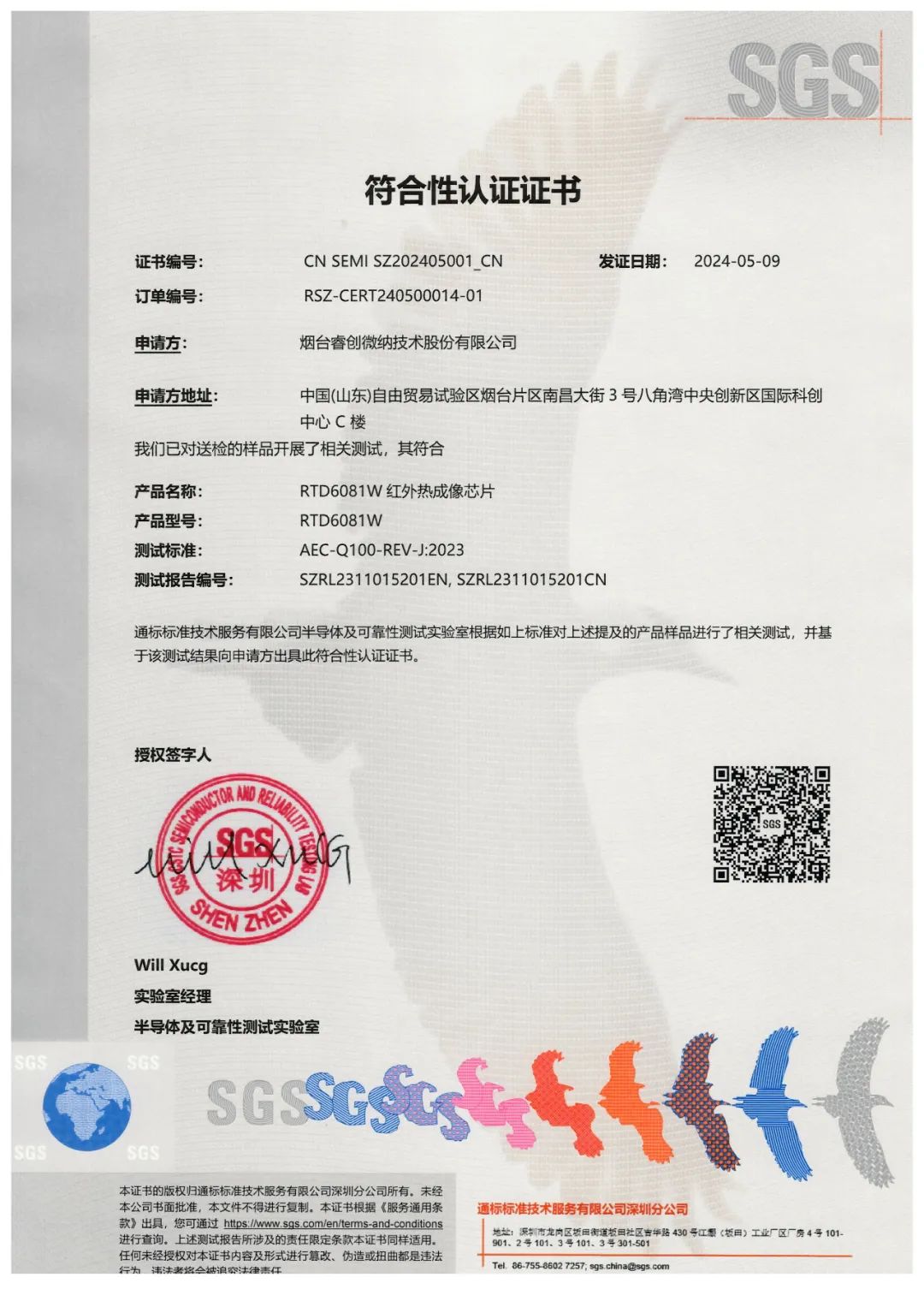 繼RTD6122W系列芯片、LY300芯片通過AEC-Q100認(rèn)證后,睿創(chuàng)微納自主研發(fā)的RTD6081W系列8微米非制冷紅外熱成像芯片也成功獲得了AEC-Q100這一汽車行業(yè)的權(quán)威認(rèn)證。