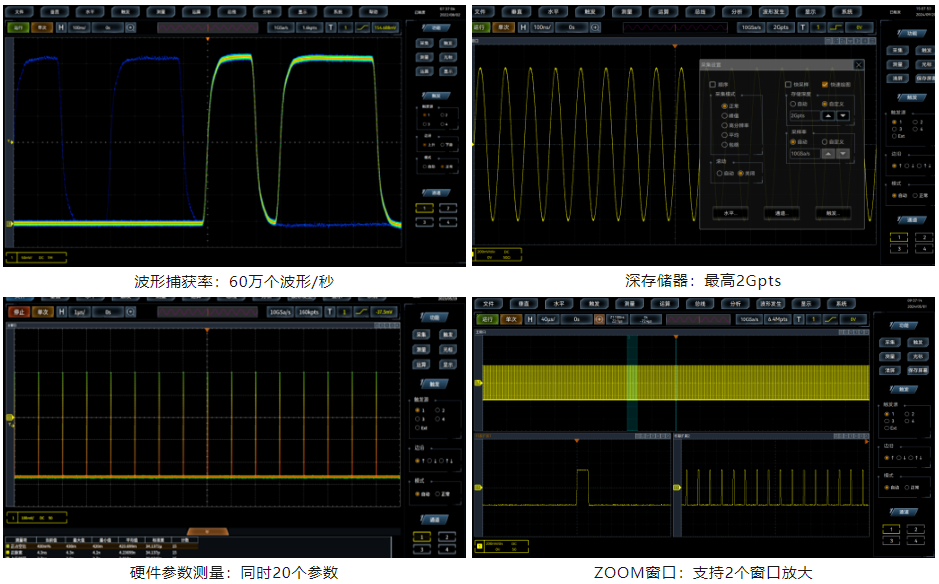 4457M系列數(shù)字示波器高達60萬個波形/秒的波形捕獲率,10GSa/s的采樣率,極大提高了毛刺和偶發(fā)事件捕獲的概率;示波器標配了分段存儲器采集,即使示波器工作在深度存儲模式下,依然可以保持快速的響應(yīng)速度和屏幕更新率;示波器支持硬件的參數(shù)測量功能,支持同時顯示20個測量項目的統(tǒng)計分析,可提供更加精確的測量結(jié)果。