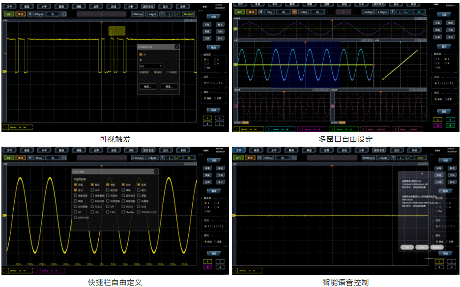 4457M系列數(shù)字示波器采用智能化、可視化的區(qū)域觸發(fā)技術(shù),可以迅速簡便地識別想要的觸發(fā)事件。支持多窗口自由設(shè)定,用戶可根據(jù)觀察需求自由對打開的波形窗口進行各種操作。支持快捷欄自由定義,用戶可自行設(shè)定功能區(qū)內(nèi)的快捷按鍵。支持智能語音交互,用戶可以通過語音向示波器發(fā)出指令,從而完成用戶想要的操作,解放雙手,操作更智能、更便捷。
