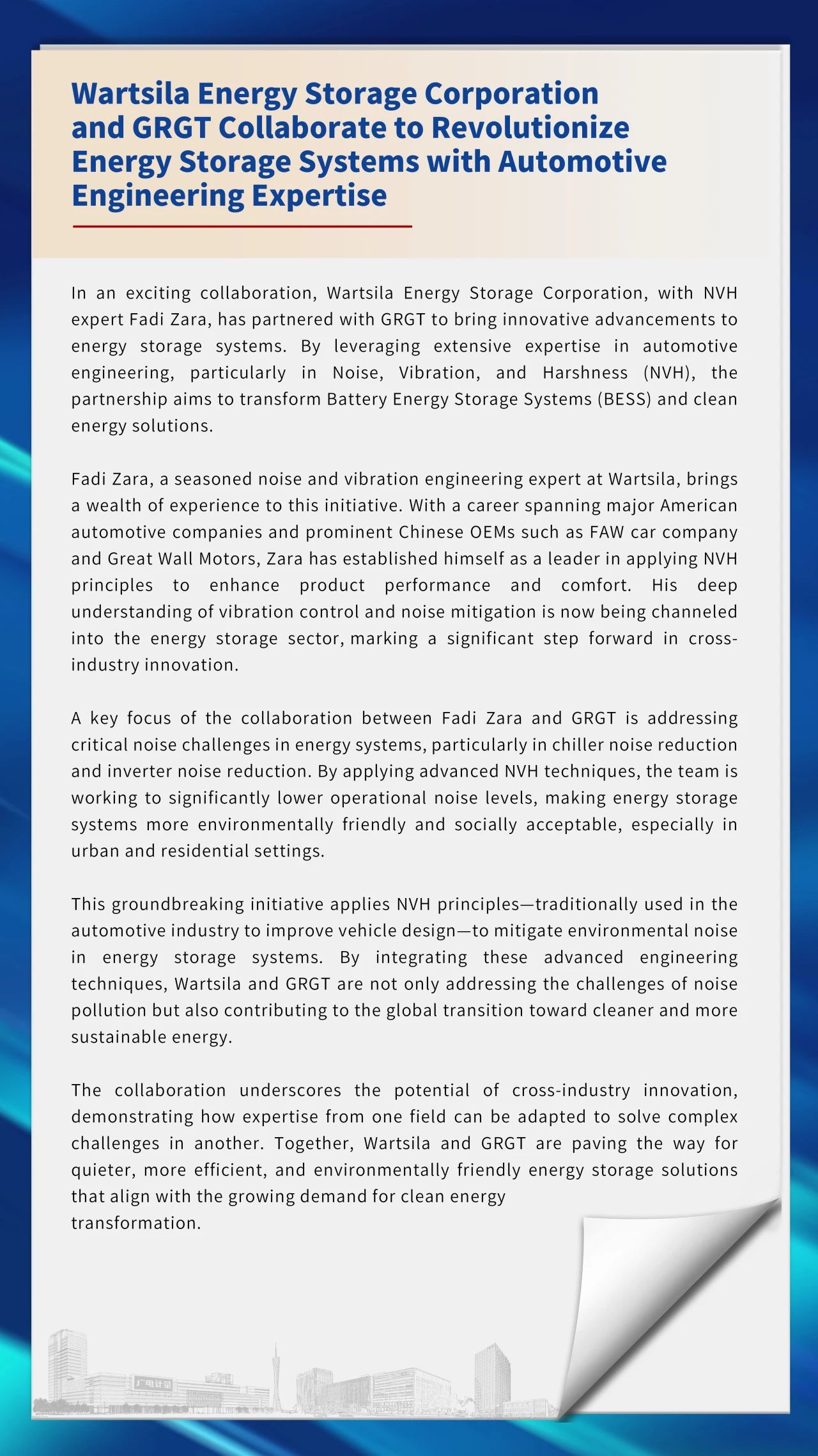 瓦錫蘭資深NVH專家法蒂先生(Fadi Zara)為這一合作帶來(lái)了豐富的經(jīng)驗(yàn)。法蒂先生的職業(yè)生涯跨越了美國(guó)主要汽車公司和中國(guó)著名的汽車公司,如一汽汽車和長(zhǎng)城汽車,他已成為NVH行業(yè)的領(lǐng)軍者。他將汽車行業(yè)的減振降噪經(jīng)驗(yàn)和專業(yè)知識(shí)引入到了儲(chǔ)能領(lǐng)域,標(biāo)志著跨行業(yè)創(chuàng)新向前邁出了重要一步。