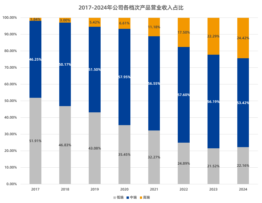 2024年,鼎陽科技高端產品線全面發(fā)力,量價齊升。從產品的銷售單價上看,銷售單價3萬以上的產品,銷售額同比增長 16.89%,銷售單價5萬元以上的產品銷售額同比增長39.25%。此外,2024年,公司高端產品營收占比延續(xù)了多年來的上升態(tài)勢,上漲至24.42%,同比上漲2.13個百分點,低端產品營收占比下降至不足1/4。這一成果得益于公司長期堅持的品牌價值深耕與高端產品戰(zhàn)略布局,充分體現(xiàn)了技術驅動與市場定位協(xié)同發(fā)力的顯著成效。