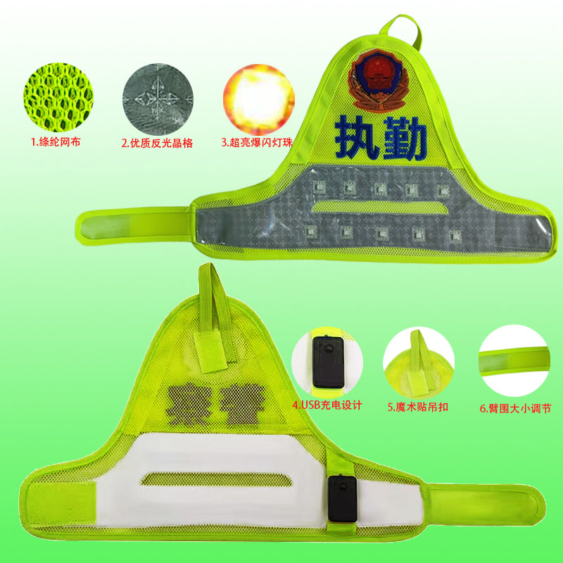 執(zhí)勤充電袖標(biāo):采用超亮led(發(fā)光二極管)冷光燈珠鑲嵌在反光袖標(biāo)上,有主動(dòng)發(fā)光警示、亮度高、節(jié)能、防水燈突出優(yōu)點(diǎn)。
