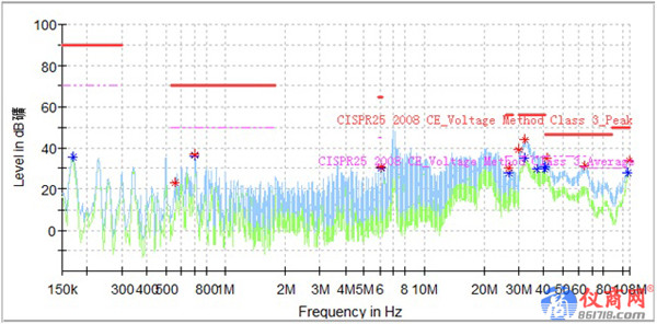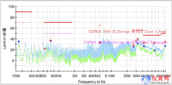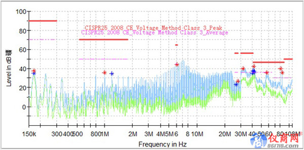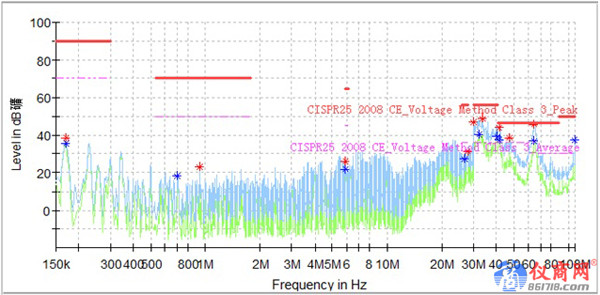 在電機(jī)控制器的EMC測(cè)試整改過程中,測(cè)試傳導(dǎo)發(fā)射低壓側(cè)正極時(shí),32M、41M、65M出現(xiàn)超標(biāo),如圖1所示;調(diào)試低壓側(cè)濾波參數(shù)效果不明顯,考慮電機(jī)控制器在整車的安裝環(huán)境以及之前的整改經(jīng)驗(yàn),將電機(jī)控制器外殼增加接地點(diǎn),變成兩點(diǎn)接地,32M、65M明顯降低,6.1M出現(xiàn)超標(biāo),如圖2所示,接下來針對(duì)6.1M頻點(diǎn)做整改。