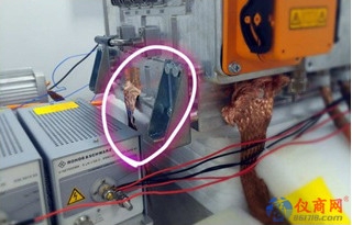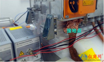 將增加的接地點(diǎn)恢復(fù),6.1M又超標(biāo),可以復(fù)原現(xiàn)象,說明6.1M處干擾確實(shí)是接地問題引起的。觀察增加的接地點(diǎn)位置,正好在DCDC輸出線正負(fù)極之間,如圖4所示,機(jī)器初始的接地點(diǎn)如圖5所示,使用銅帶編織網(wǎng)接接地參考平面,兩點(diǎn)接地會(huì)引起地環(huán)路干擾,6.1M超標(biāo)很有可能是地環(huán)路干擾引起的。
