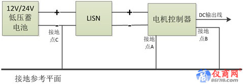 圖6、測(cè)試系統(tǒng)模型圖(接地點(diǎn)C是測(cè)試標(biāo)準(zhǔn)要求的:低壓蓄電池負(fù)極接地)
