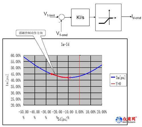 隨著轉(zhuǎn)速的不斷升高,繞組中的感應(yīng)電壓幅值越來越高。 當(dāng)直流母線電壓一定時,繞組端電壓的幅值有限。 這樣,如果仍然根據(jù)MTPA等算法發(fā)送電壓指令,繞組電壓甚至低于感應(yīng)電動勢的電壓, 這就會導(dǎo)致繞組中的電流不足,逆變器無法輸送足夠的功率給電動機。 為了解決這一個問題,有意在d-軸上增加負(fù)的電流,讓繞組電壓的相位超前感應(yīng)電動勢, 以保持輸出到電動機的功率。這就是弱磁控制。 對于IPM電機來說,我們定義三種弱磁的“境界” 1)充分利用永磁扭矩和磁阻扭矩的MTPA算法。 2)直流母線電壓一定條件下,保持輸出扭矩恒定的“淺弱磁” 3)直流母線電壓一定條件下,保持高轉(zhuǎn)速和恒定輸出功率的“深度弱磁”。
