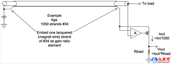 由于電纜由1050股線組成,電流會(huì)流入MOSFET和增益元件,正比于總電流除以1050。增益元件和電纜均由銅構(gòu)成,并且處于緊密的熱接觸中,抵消了輸出隨溫度的變化。