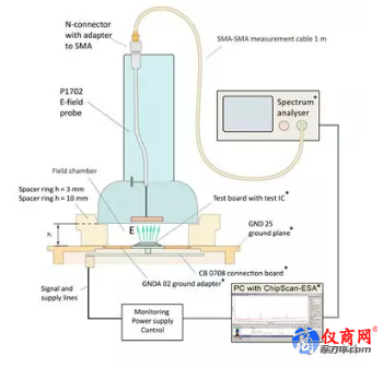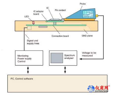 德國(guó)LANGER公司開(kāi)發(fā)和生產(chǎn)的用于測(cè)量IC引腳的傳導(dǎo)發(fā)射的磁場(chǎng)探頭,符合IEC61967-6測(cè)試要求,磁場(chǎng)探頭法是通過(guò)測(cè)試PCB板導(dǎo)線上的電流來(lái)評(píng)定集成電路的電磁發(fā)射。芯片引腳通過(guò)PCB板上的導(dǎo)線與電源或外圍電路相連,因而它產(chǎn)生的射頻電流可用一個(gè)靠近的磁場(chǎng)探頭獲取,由電磁感應(yīng)定律,探頭輸出端的電壓正比于導(dǎo)線上的射頻電流。