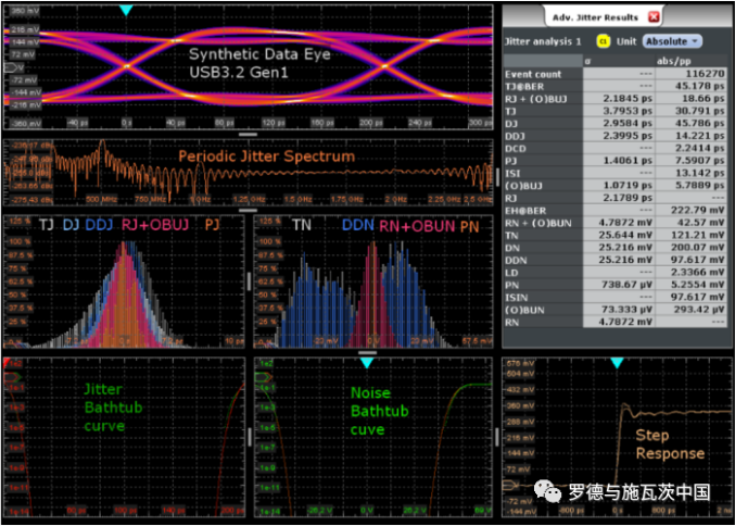 RTP能夠提供:常見(jiàn)抖動(dòng)和噪聲分量的計(jì)算、基于信號(hào)模型方法的高精度結(jié)果、顯示階躍響應(yīng)與浴盆曲線、具有確定性抖動(dòng)和噪聲的合成眼圖,并以直方圖、軌跡或頻譜視圖顯示抖動(dòng)和噪聲分量。