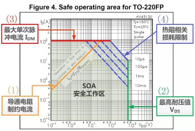 SOA指的是安全工作區(qū),由一系列限制條件組成的一個(gè)漏源極電壓VDS和漏極電流ID的二維坐標(biāo)圖,當(dāng)開關(guān)器件正常工作時(shí)的電壓和電流都不應(yīng)該超過該限定范圍,此區(qū)域就是該開關(guān)器件的安全工作區(qū)域。SOA安全工作區(qū)是保證開關(guān)電源能夠穩(wěn)定工作而不出現(xiàn)損壞、炸機(jī)等問題的重要保證,是目前開關(guān)電源行業(yè)必要的測試項(xiàng)目之一。