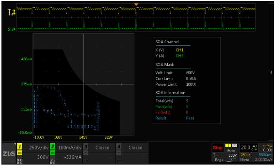ZDS3024及以上示波器為解決長期困擾工程師的SOA安全工作區(qū)測試問題,推出SOA自動(dòng)化測試插件,只需要設(shè)置好對(duì)應(yīng)的參數(shù),就能自動(dòng)卡出安全工作區(qū)域,自動(dòng)化統(tǒng)計(jì)電壓、電流是否落于安全工作區(qū)內(nèi),可持續(xù)測試,自動(dòng)在右下角顯示統(tǒng)計(jì)條件、以及結(jié)果pass、或者fail。