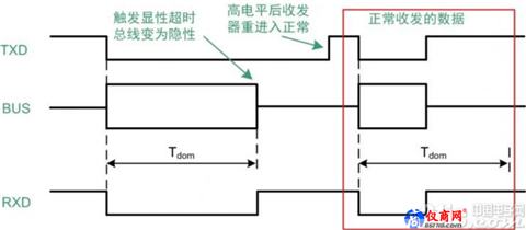 顯性超時(shí)的增加主要是為了防止CAN總線網(wǎng)絡(luò)由于硬件或軟件故障使得TXD長(zhǎng)期處于“0”電平狀態(tài)。TXD保持“0”意味著CAN網(wǎng)絡(luò)為顯性電平,整個(gè)網(wǎng)絡(luò)的所有節(jié)點(diǎn)都不能收發(fā)數(shù)據(jù),即總線處于癱瘓狀態(tài)。顯性超時(shí)可以通過(guò)收發(fā)器的硬件計(jì)時(shí)避免總線出現(xiàn)這種情況。如圖 4所示,Tdom為顯性超時(shí)時(shí)長(zhǎng),每次TXD為“0”時(shí)收發(fā)器開始計(jì)時(shí),超過(guò)Tdom時(shí)收發(fā)器內(nèi)部釋放總線,總線狀態(tài)處于隱性電平。不同收發(fā)器的顯性超時(shí)時(shí)間不同,實(shí)際應(yīng)用需要考慮顯性超時(shí)時(shí)間對(duì)總線最低波特率的影響。CAN協(xié)議規(guī)定錯(cuò)誤幀最多可以有11個(gè)連續(xù)的顯性位,為了避免顯性超時(shí)不對(duì)其造成影響,可以根據(jù)收發(fā)器的最小顯性超時(shí)時(shí)間計(jì)算實(shí)際使用的最低波特率。BPSMin = 11/Tdom_min。如CTM1051Q的顯性超時(shí)時(shí)間為0.3ms,則計(jì)算最小波特率為11/0.3=36.67kbps。