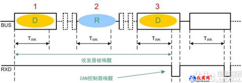 ISO11898-5給出了低功耗模式的高速CAN總線單元,CAN收發(fā)器可以處于睡眠模式以降低功耗,并通過(guò)一定的總線時(shí)序喚醒收發(fā)器。如圖 5為CTM1044KAT的喚醒時(shí)序圖,睡眠狀態(tài)下,當(dāng)總線出現(xiàn)長(zhǎng)度大于TWK的3個(gè)顯性、隱性、顯性的電平后,睡眠狀態(tài)的收發(fā)器即被喚醒,中途遇到的任何小于TWK的干擾信號(hào)電平將被硬件過(guò)濾。TWK的定義是為了使收發(fā)器僅安全可靠地接收喚醒信號(hào),避免由于總線干擾導(dǎo)致誤觸發(fā)。CAN控制器收到RXD信號(hào)后,可通過(guò)軟件設(shè)置觸發(fā)喚醒控制器,從而進(jìn)一步設(shè)置模塊STB引腳進(jìn)入正常工作模式。這種喚醒模式中,當(dāng)總線的所有節(jié)點(diǎn)都處于睡眠狀態(tài)時(shí),只要總線某個(gè)節(jié)點(diǎn)發(fā)出信號(hào),所有節(jié)點(diǎn)都會(huì)被喚醒。