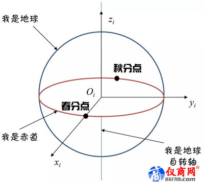 地心慣性系:以地球的地心為原點,以地心指向春分點和秋分點的連線為X軸、Y軸,以地球自轉軸指向北極為Z軸組成的右手坐標系。因為春分點和秋分點不是地球表面上和地球固定的兩個點,而是地球所屬宇宙空間中兩個固定的點(因為赤道面和黃道面是固定的面)。所以,春分點和秋分點不會因為地球的自轉而移動,故地心慣性系是相對靜止的,不會隨地球自轉而移動。