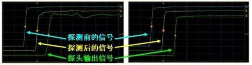 然后使用探頭點(diǎn)測測試夾具去探測被測信號,通過 SMA 直連的波形因?yàn)槭芴筋^負(fù)載的影響而變成黃色的波形,探頭通道顯示的是綠色的波形。然后分別測試上升時(shí)間,可以看出無源探頭和有源探頭對高速信號的影響。