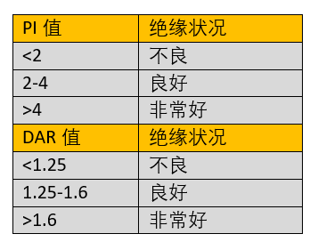 一般來說高于 1.4-1.6 的介質(zhì)吸收比 DAR,高于 2-4 的極化指數(shù) PI 被認為絕緣良好。
